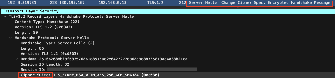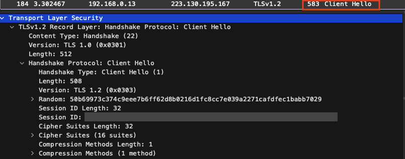 - Client Hello (클라이언트 → 서버) : TLS/SSL 버전, Random data, 세션 ID, Cipher Suite(암호화 알고리즘 집합) 등의 내용을 서버에 전달.
